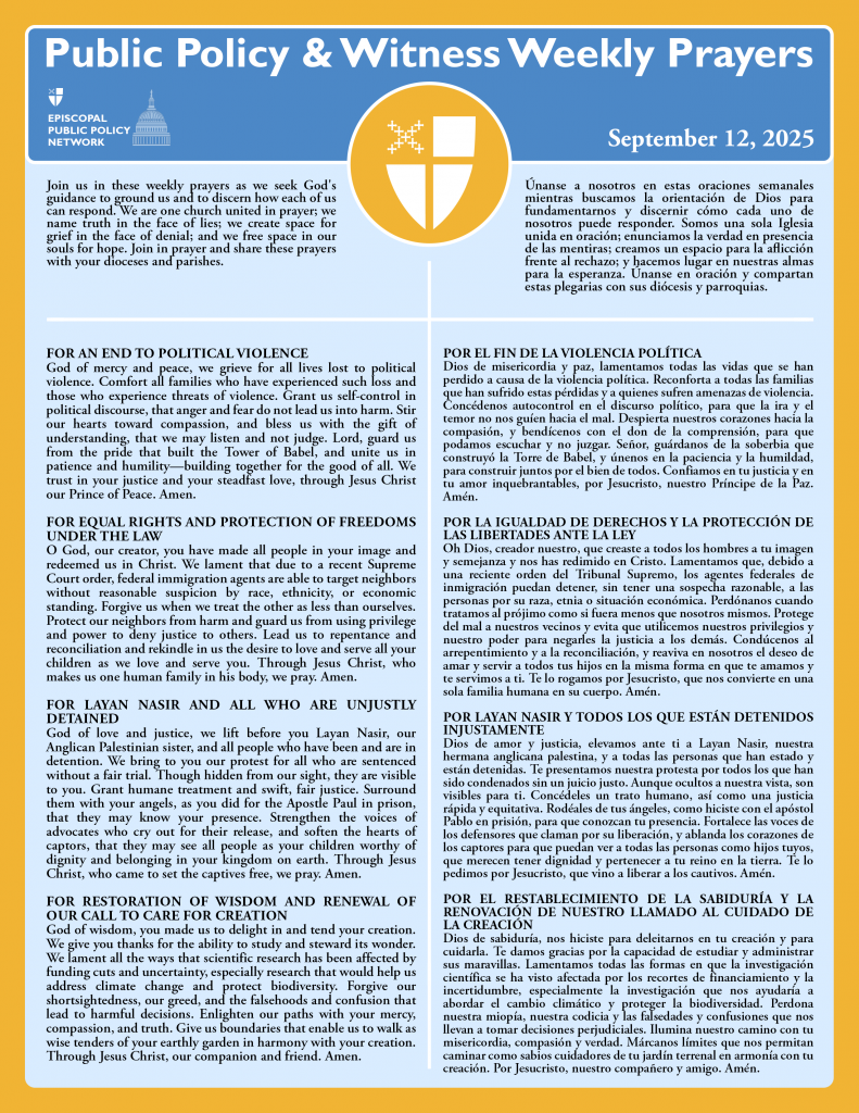 As a church, our advocacy continues, and we invite you to join us. The Episcopal Public Policy Network has weekly action alerts, resources, webinars, and trainings. Learn more here.