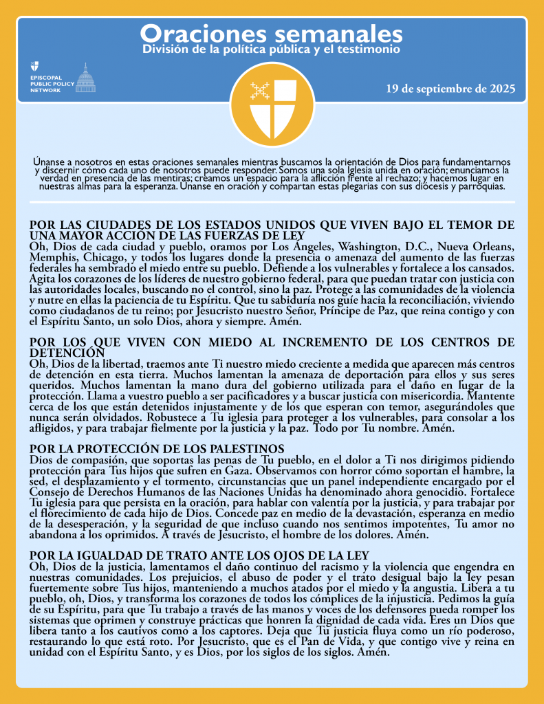 Como iglesia, nuestra defensoría continúa, y los invitamos a unirse a nosotros. La Red Episcopal de Políticas Públicas cuenta con alertas semanales de acción, recursos, seminarios web y capacitaciones. Entérese más aquí.