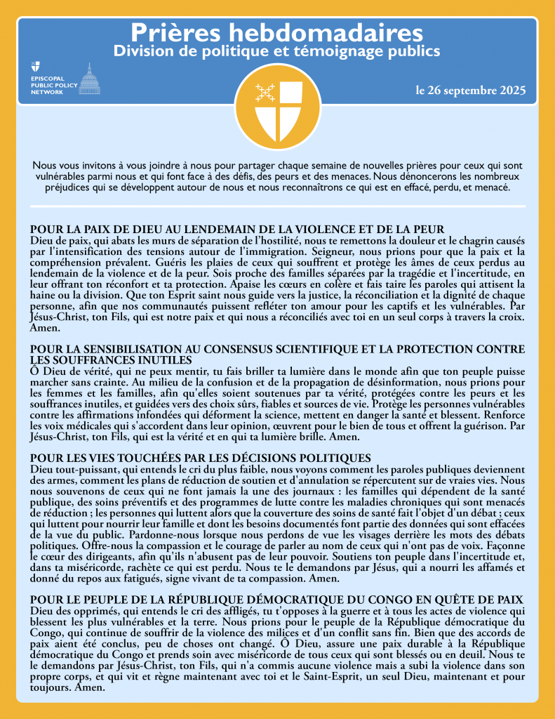 Dieu tout-puissant, qui entends le cri du plus faible, nous voyons comment les paroles publiques deviennent des armes, comment les plans de réduction de soutien et d’annulation se répercutent sur de vraies vies. Nous nous souvenons de ceux qui ne font jamais la une des journaux : les familles qui dépendent de la santé publique, des soins préventifs et des programmes de lutte contre les maladies chroniques qui sont menacés de réduction ; les personnes qui luttent alors que la couverture des soins de santé fait l’objet d’un débat ; ceux qui luttent pour nourrir leur famille et dont les besoins documentés font partie des données qui sont effacées de la vue du public. Pardonne-nous lorsque nous perdons de vue les visages derrière les mots des débats politiques. Offre-nous la compassion et le courage de parler au nom de ceux qui n’ont pas de voix. Façonne le cœur des dirigeants, afin qu’ils n’abusent pas de leur pouvoir. Soutiens ton peuple dans l’incertitude et, dans ta miséricorde, rachète ce qui est perdu. Nous te le demandons par Jésus, qui a nourri les affamés et donné du repos aux fatigués, signe vivant de ta compassion. Amen.