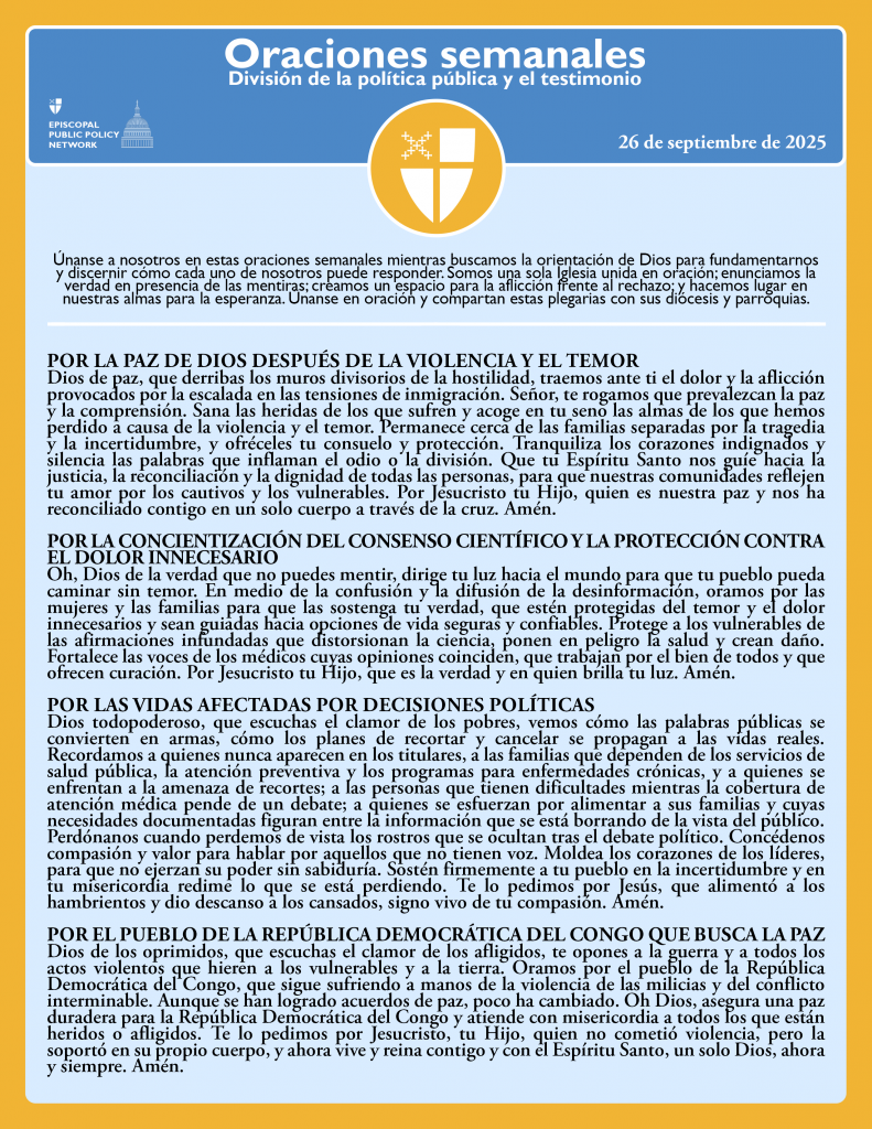 Como iglesia, nuestra defensoría continúa, y los invitamos a unirse a nosotros. La Red Episcopal de Políticas Públicas cuenta con alertas semanales de acción, recursos, seminarios web y capacitaciones. Entérese más aquí.