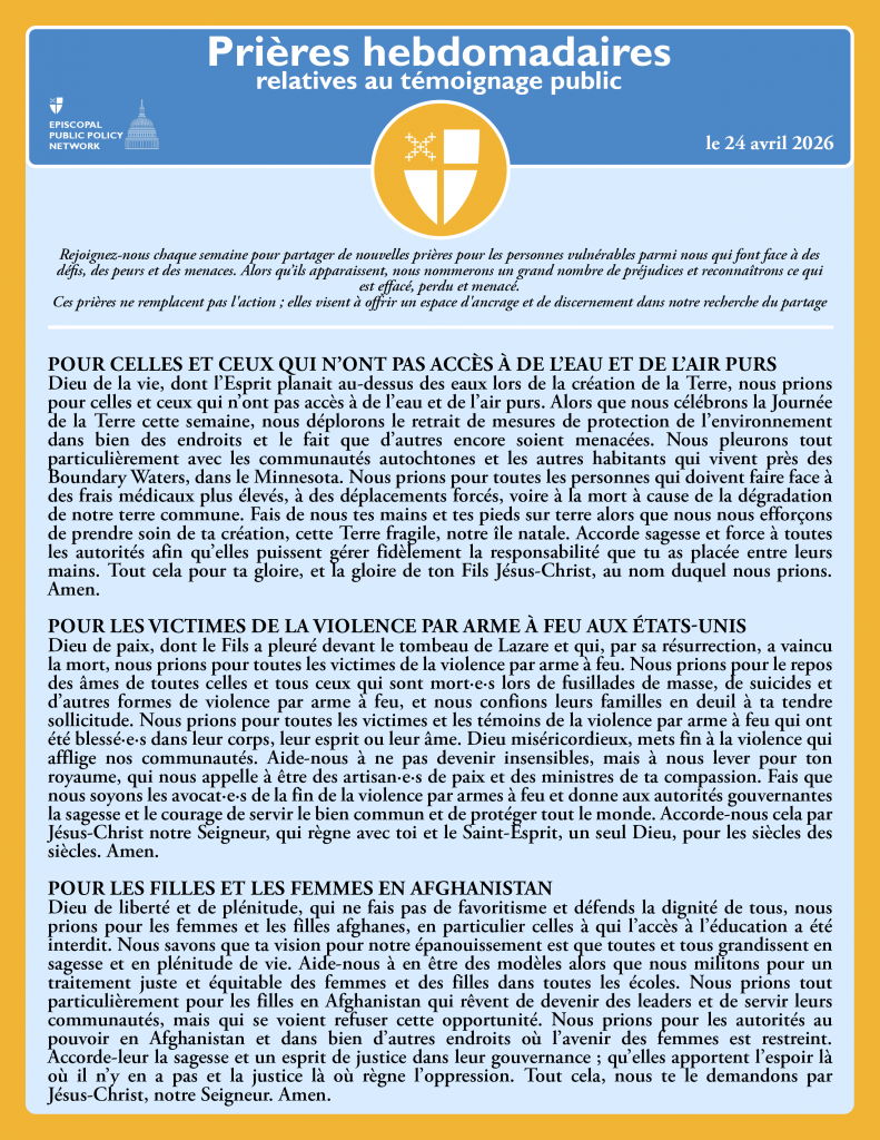 Rejoignez-nous chaque semaine pour partager de nouvelles prières pour les personnes vulnérables parmi nous qui font face à des défis, des peurs et des menaces. Alors qu’ils apparaissent, nous nommerons un grand nombre de préjudices et reconnaîtrons ce qui est effacé, perdu et menacé.