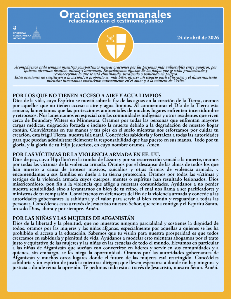 Dios de paz, cuyo Hijo lloró en la tumba de Lázaro y por su resurrección venció a la muerte, oramos por todas las víctimas de la violencia armada. Oramos por el descanso de las almas de todos los que han muerto a causa de tiroteos masivos, suicidios y otras formas de violencia armada, y encomendamos a sus familias en duelo a tu tierna protección. Oramos por todas las víctimas y testigos de la violencia armada cuyos cuerpos, mentes o espíritus han resultado lesionados. Dios misericordioso, pon fin a la violencia que aflige a nuestras comunidades. Ayúdanos a no perder nuestra sensibilidad, sino a levantarnos en bien de tu reino, el cual nos llama a ser pacificadores y ministros de tu compasión. Conviértenos en defensores del fin de la violencia armada y concede a las autoridades gobernantes la sabiduría y el valor para servir al bien común y resguardar a todas las personas. Concédenos esto a través de Jesucristo nuestro Señor, que reina contigo y el Espíritu Santo, un solo Dios, ahora y por siempre. Amén.