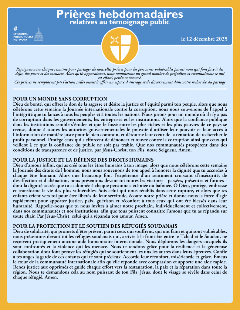 Dieu de bonté, qui offres le don de la sagesse et désire la justice et l’équité parmi ton peuple, alors que nous célébrons cette semaine la Journée internationale contre la corruption, nous nous souvenons de l’appel à l’intégrité que tu lances à tous les peuples et à toutes les nations. Nous prions pour un monde où il n’y a pas de corruption dans les gouvernements, les entreprises et les institutions. Alors que la confiance publique dans les institutions semble s’éroder et que le fossé entre les plus riches et les plus pauvres de ce pays se creuse, donne à toutes les autorités gouvernementales le pouvoir d’utiliser leur pouvoir et leur accès à l’information de manière juste pour le bien commun, et détourne leur cœur de la tentation de rechercher le profit personnel. Protège ceux qui s’efforcent de dénoncer et œuvre contre la corruption ainsi que ceux qui veillent à ce que la confiance du public ne soit pas trahie. Que nos communautés prospèrent dans des conditions de transparence et de justice, par Jésus-Christ, ton Fils, notre Seigneur. Amen.