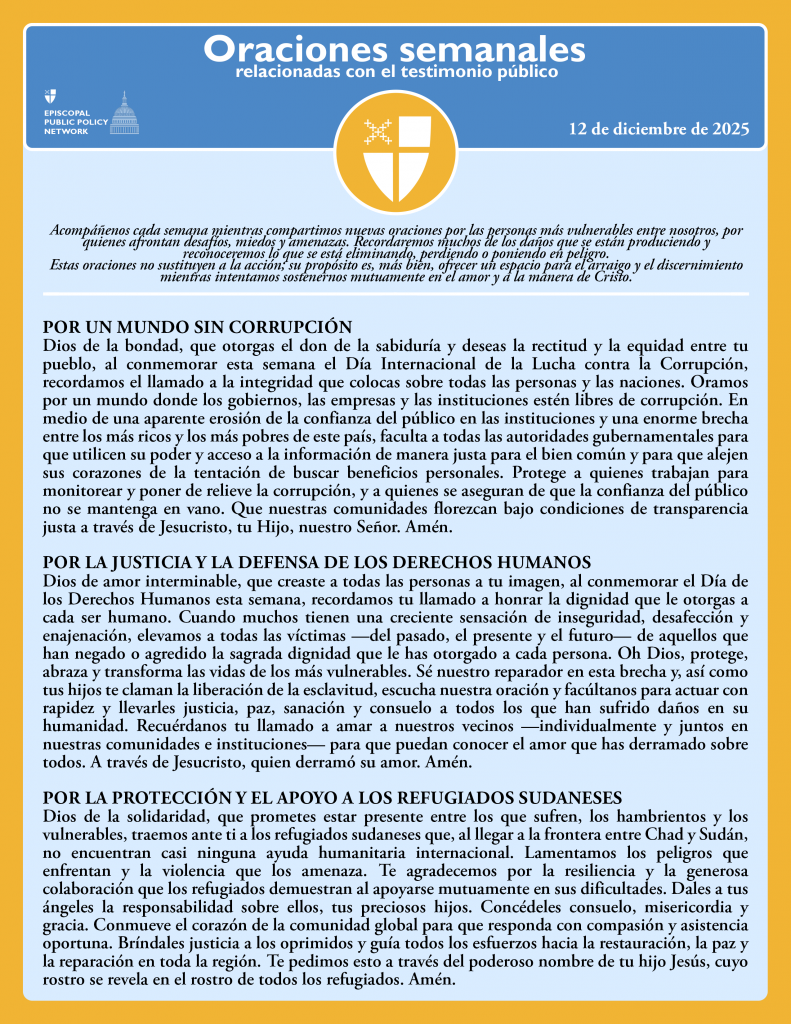 Dios de amor interminable, que creaste a todas las personas a tu imagen, al conmemorar el Día de los Derechos Humanos esta semana, recordamos tu llamado a honrar la dignidad que le otorgas a cada ser humano. Cuando muchos tienen una creciente sensación de inseguridad, desafección y enajenación, elevamos a todas las víctimas —del pasado, el presente y el futuro— de aquellos que han negado o agredido la sagrada dignidad que le has otorgado a cada persona. Oh Dios, protege, abraza y transforma las vidas de los más vulnerables. Sé nuestro reparador en esta brecha y, así como tus hijos te claman la liberación de la esclavitud, escucha nuestra oración y facúltanos para actuar con rapidez y llevarles justicia, paz, sanación y consuelo a todos los que han sufrido daños en su humanidad. Recuérdanos tu llamado a amar a nuestros vecinos —individualmente y juntos en nuestras comunidades e instituciones— para que puedan conocer el amor que has derramado sobre todos. A través de Jesucristo, quien derramó su amor. Amén.