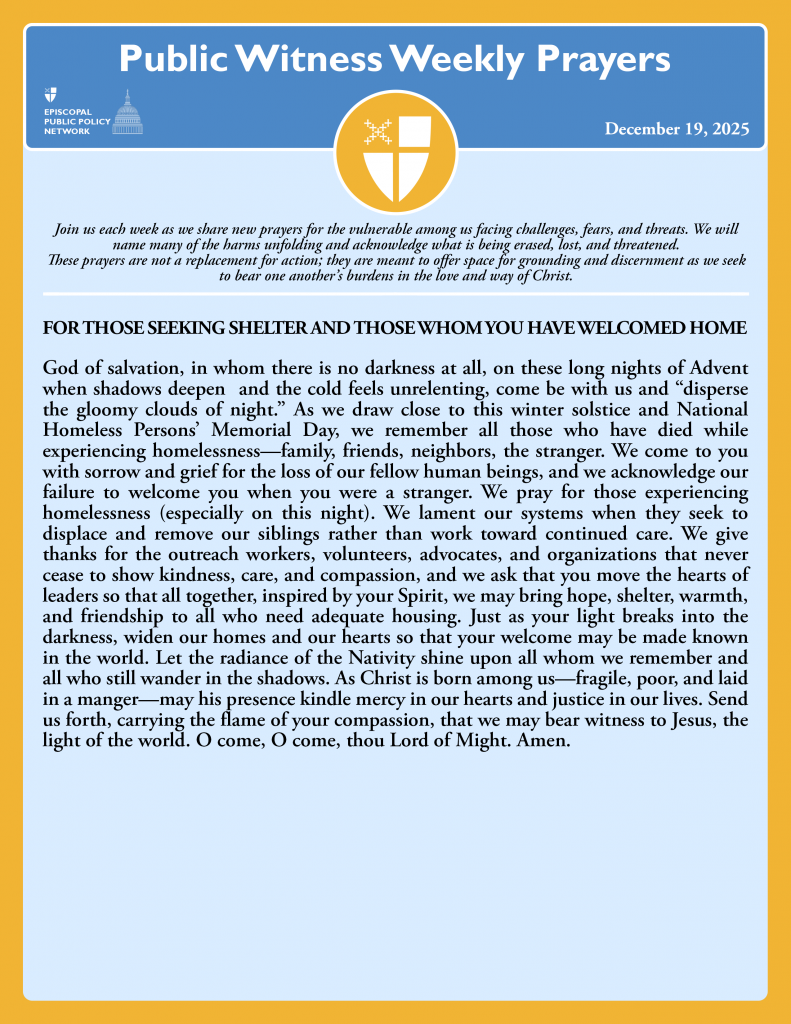 God of salvation, in whom there is no darkness at all, on these long nights of Advent when shadows deepen and the cold feels unrelenting, come be with us and “disperse the gloomy clouds of night.” As we draw close to this winter solstice and National Homeless Persons’ Memorial Day, we remember all those who have died while experiencing homelessness—family, friends, neighbors, the stranger. We come to you with sorrow and grief for the loss of our fellow human beings, and we acknowledge our failure to welcome you when you were a stranger. We pray for those experiencing homelessness (especially on this night). We lament our systems when they seek to displace and remove our siblings rather than work toward continued care. We give thanks for the outreach workers, volunteers, advocates, and organizations that never cease to show kindness, care, and compassion, and we ask that you move the hearts of leaders so that all together, inspired by your Spirit, we may bring hope, shelter, warmth, and friendship to all who need adequate housing. Just as your light breaks into the darkness, widen our homes and our hearts so that your welcome may be made known in the world. Let the radiance of the Nativity shine upon all whom we remember and all who still wander in the shadows. As Christ is born among us—fragile, poor, and laid in a manger—may his presence kindle mercy in our hearts and justice in our lives. Send us forth, carrying the flame of your compassion, that we may bear witness to Jesus, the light of the world. O come, O come, thou Lord of Might. Amen.