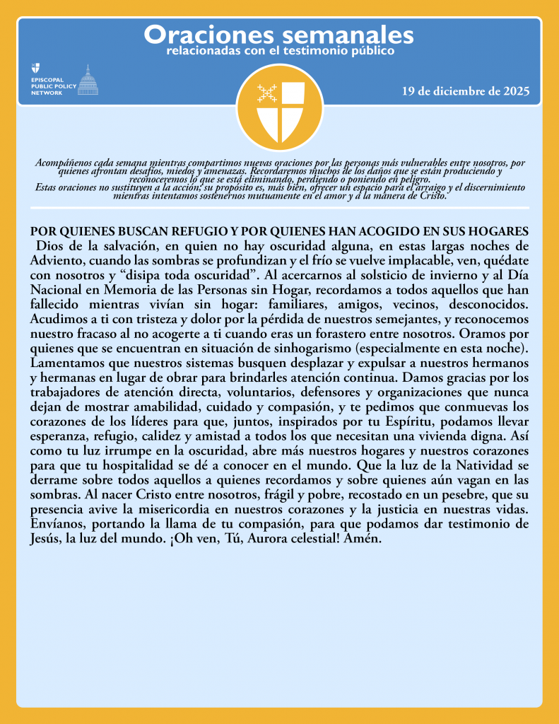 Dios de la salvación, en quien no hay oscuridad alguna, en estas largas noches de Adviento, cuando las sombras se profundizan y el frío se vuelve implacable, ven, quédate con nosotros y “disipa toda oscuridad”. Al acercarnos al solsticio de invierno y al Día Nacional en Memoria de las Personas sin Hogar, recordamos a todos aquellos que han fallecido mientras vivían sin hogar: familiares, amigos, vecinos, desconocidos. Acudimos a ti con tristeza y dolor por la pérdida de nuestros semejantes, y reconocemos nuestro fracaso al no acogerte a ti cuando eras un forastero entre nosotros. Oramos por quienes que se encuentran en situación de sinhogarismo (especialmente en esta noche). Lamentamos que nuestros sistemas busquen desplazar y expulsar a nuestros hermanos y hermanas en lugar de obrar para brindarles atención continua. Damos gracias por los trabajadores de atención directa, voluntarios, defensores y organizaciones que nunca dejan de mostrar amabilidad, cuidado y compasión, y te pedimos que conmuevas los corazones de los líderes para que, juntos, inspirados por tu Espíritu, podamos llevar esperanza, refugio, calidez y amistad a todos los que necesitan una vivienda digna. Así como tu luz irrumpe en la oscuridad, abre más nuestros hogares y nuestros corazones para que tu hospitalidad se dé a conocer en el mundo. Que la luz de la Natividad se derrame sobre todos aquellos a quienes recordamos y sobre quienes aún vagan en las sombras. Al nacer Cristo entre nosotros, frágil y pobre, recostado en un pesebre, que su presencia avive la misericordia en nuestros corazones y la justicia en nuestras vidas. Envíanos, portando la llama de tu compasión, para que podamos dar testimonio de Jesús, la luz del mundo. ¡Oh ven, Tú, Aurora celestial! Amén.