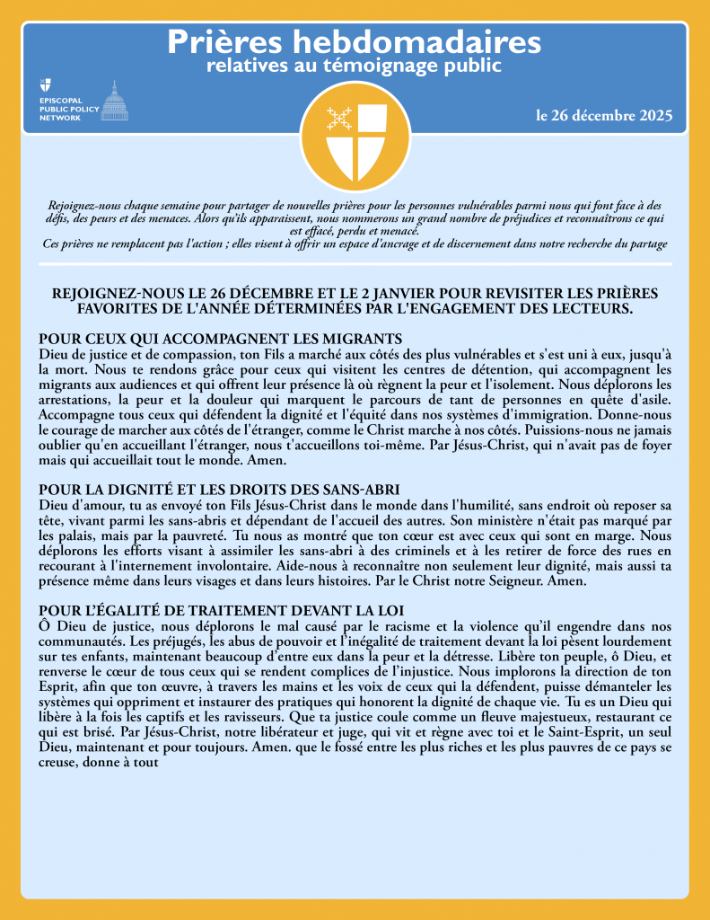 Dieu de justice et de compassion, ton Fils a marché aux côtés des plus vulnérables et s’est uni à eux, jusqu’à la mort. Nous te rendons grâce pour ceux qui visitent les centres de détention, qui accompagnent les migrants aux audiences et qui offrent leur présence là où règnent la peur et l’isolement. Nous déplorons les arrestations, la peur et la douleur qui marquent le parcours de tant de personnes en quête d’asile. Accompagne tous ceux qui défendent la dignité et l’équité dans nos systèmes d’immigration. Donne-nous le courage de marcher aux côtés de l’étranger, comme le Christ marche à nos côtés. Puissions-nous ne jamais oublier qu’en accueillant l’étranger, nous t’accueillons toi-même. Par Jésus-Christ, qui n’avait pas de foyer mais qui accueillait tout le monde. Amen.