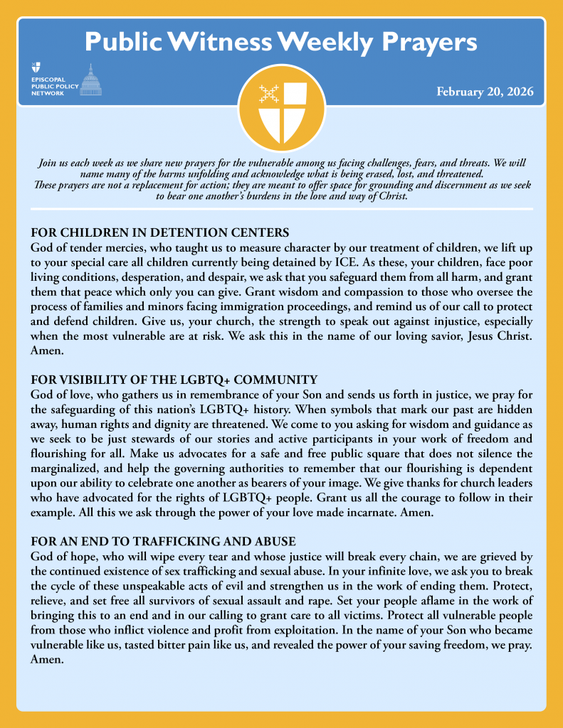 God of tender mercies, who taught us to measure character by our treatment of children, we lift up to your special care all children currently being detained by ICE. As these, your children, face poor living conditions, desperation, and despair, we ask that you safeguard them from all harm, and grant them that peace which only you can give. Grant wisdom and compassion to those who oversee the process of families and minors facing immigration proceedings, and remind us of our call to protect and defend children. Give us, your church, the strength to speak out against injustice, especially when the most vulnerable are at risk. We ask this in the name of our loving savior, Jesus Christ. Amen.