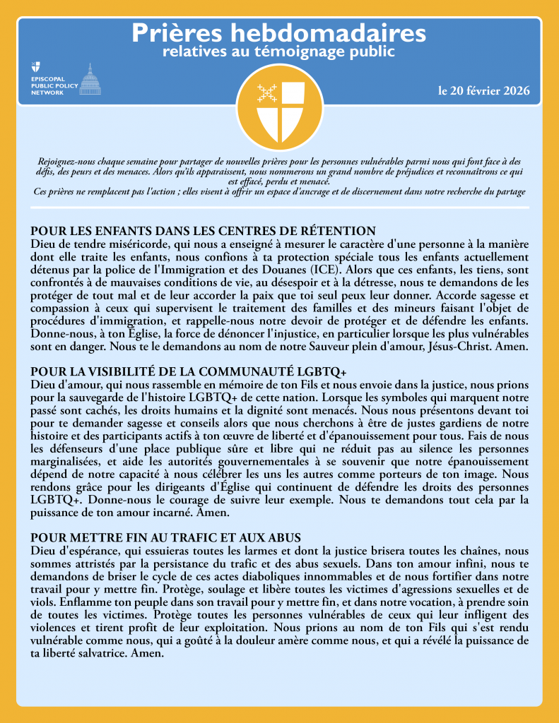 Dieu de tendre miséricorde, qui nous a enseigné à mesurer le caractère d’une personne à la manière dont elle traite les enfants, nous confions à ta protection spéciale tous les enfants actuellement détenus par la police de l’Immigration et des Douanes (ICE). Alors que ces enfants, les tiens, sont confrontés à de mauvaises conditions de vie, au désespoir et à la détresse, nous te demandons de les protéger de tout mal et de leur accorder la paix que toi seul peux leur donner. Accorde sagesse et compassion à ceux qui supervisent le traitement des familles et des mineurs faisant l’objet de procédures d’immigration, et rappelle-nous notre devoir de protéger et de défendre les enfants. Donne-nous, à ton Église, la force de dénoncer l’injustice, en particulier lorsque les plus vulnérables sont en danger. Nous te le demandons au nom de notre Sauveur plein d’amour, Jésus-Christ. Amen.