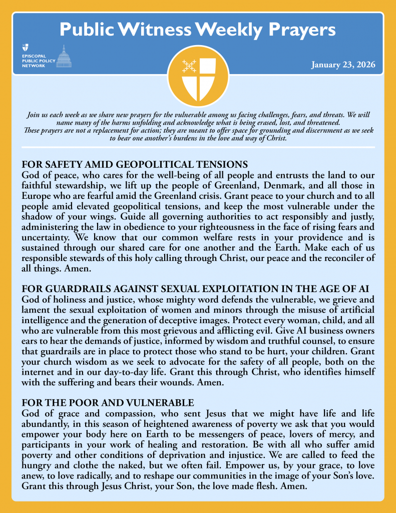 God of peace, who cares for the well-being of all people and entrusts the land to our faithful stewardship, we lift up the people of Greenland, Denmark, and all those in Europe who are fearful amid the Greenland crisis. Grant peace to your church and to all people amid elevated geopolitical tensions, and keep the most vulnerable under the shadow of your wings. Guide all governing authorities to act responsibly and justly, administering the law in obedience to your righteousness in the face of rising fears and uncertainty. We know that our common welfare rests in your providence and is sustained through our shared care for one another and the Earth. Make each of us responsible stewards of this holy calling through Christ, our peace and the reconciler of all things. Amen.