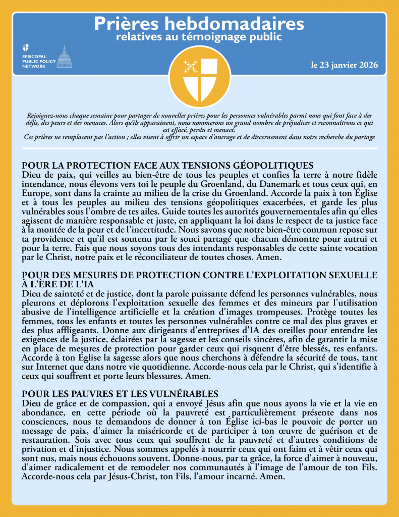 Dieu de sainteté et de justice, dont la parole puissante défend les personnes vulnérables, nous pleurons et déplorons l’exploitation sexuelle des femmes et des mineurs par l’utilisation abusive de l’intelligence artificielle et la création d’images trompeuses. Protège toutes les femmes, tous les enfants et toutes les personnes vulnérables contre ce mal des plus graves et des plus affligeants. Donne aux dirigeants d’entreprises d’IA des oreilles pour entendre les exigences de la justice, éclairées par la sagesse et les conseils sincères, afin de garantir la mise en place de mesures de protection pour garder ceux qui risquent d’être blessés, tes enfants. Accorde à ton Église la sagesse alors que nous cherchons à défendre la sécurité de tous, tant sur Internet que dans notre vie quotidienne. Accorde-nous cela par le Christ, qui s’identifie à ceux qui souffrent et porte leurs blessures. Amen.