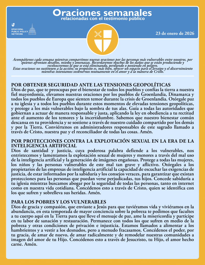 Dios de gracia y compasión, que enviaste a Jesús para que tuviéramos vida y viviéramos en la abundancia, en esta temporada de mayor conciencia sobre la pobreza te pedimos que facultes a tu cuerpo aquí en la Tierra para que lleve el mensaje de paz, ame la misericordia y participe en tu labor de sanación y restauración. Permanece con todos los que sufren en medio de la pobreza y otras condiciones de privación e injusticia. Estamos llamados a alimentar a los hambrientos y a vestir a los desnudos, pero a menudo fracasamos. Concédenos el poder, por tu gracia, de amar de nuevo, de amar radicalmente y de remodelar nuestras comunidades a imagen del amor de tu Hijo. Concédenos esto a través de Jesucristo, tu Hijo, el amor hecho carne. Amén.