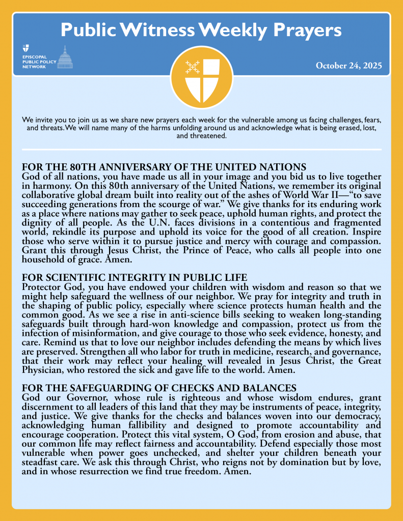 As a church, our advocacy continues, and we invite you to join us. The Episcopal Public Policy Network has weekly action alerts, resources, webinars, and trainings. Learn more here.