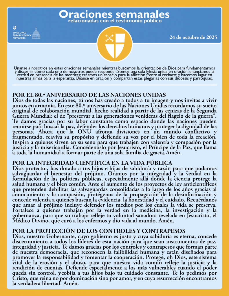 Dios, nuestro Gobernante, cuyo gobierno es justo y cuya sabiduría es eterna, concede discernimiento a todos los líderes de esta nación para que sean instrumentos de paz, integridad y justicia. Te damos gracias por los controles y contrapesos que forman parte de nuestra democracia, que reconocen la falibilidad humana y están diseñados para promover la responsabilidad y fomentar la cooperación. Protege, oh Dios, este sistema vital de la erosión y el abuso, para que nuestra vida común refleje la justicia y la rendición de cuentas. Defiende especialmente a los más vulnerables cuando el poder queda sin control, y cobija a tus hijos bajo tu cuidado constante. Te lo pedimos por Cristo, que reina no por dominación sino por amor, y en cuya resurrección encontramos la verdadera libertad. Amén.