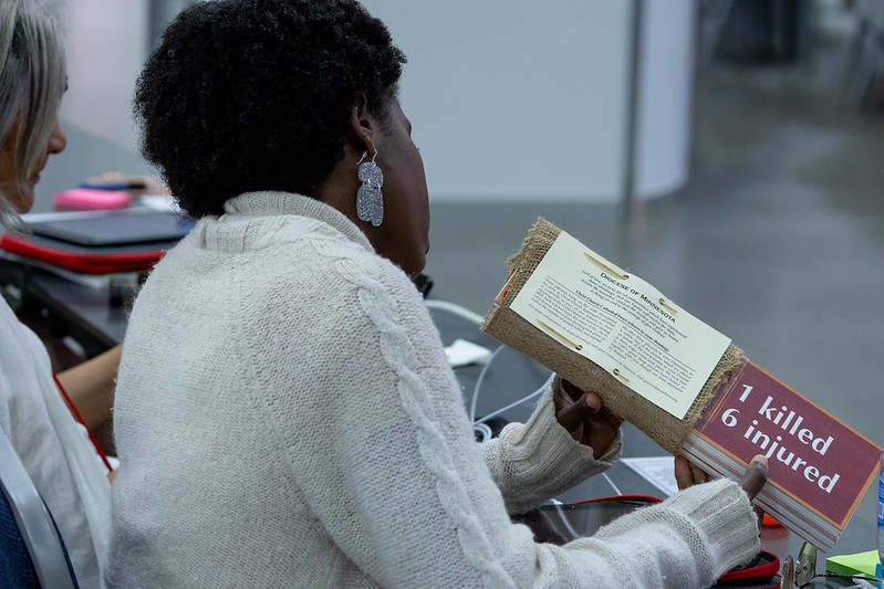 - Remembering victims of gun violence: This morning in the House of Deputies, each deputation received placards from Christ Church Episcopal Cathedral in Louisville commemorating mass shootings in their regions. The placards hung in the cathedral during 2023. In the early afternoon, Bishops United Against Gun Violence walked to nearby Jefferson Square Park for its fourth General Convention Witness Against Gun Violence. Presiding Bishop-elect Sean Rowe offered remarks, as well as participants in Youth Working to End Gun Violence.